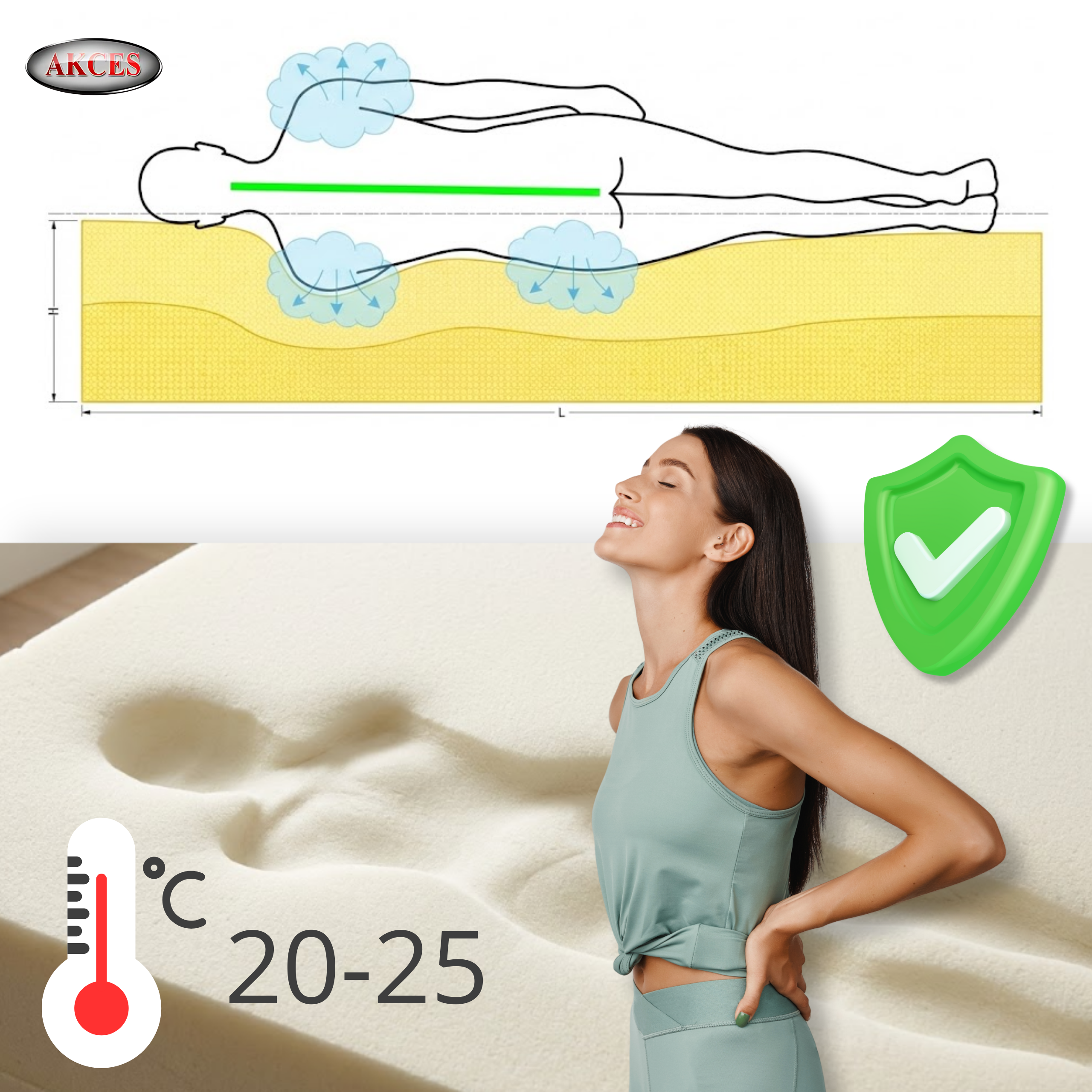 Pianka z pamięcią kształtu dopasowuje się do ciała, reagując na jego ciepło. Redukuje punkty ucisku i poprawia krążenie.